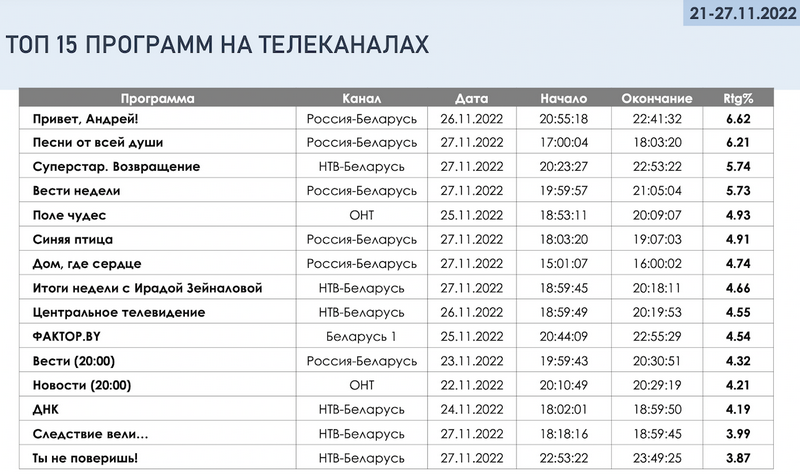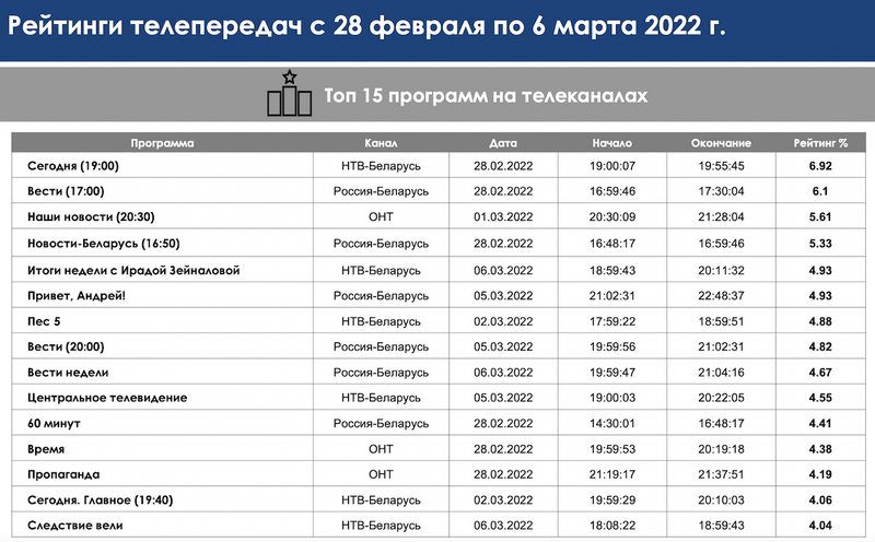 Агулам праграмы пра палітыку (выпускі навін і прапагандысцкія ток-шоу) займалі 12 з 15-ці пазіцый у топе.