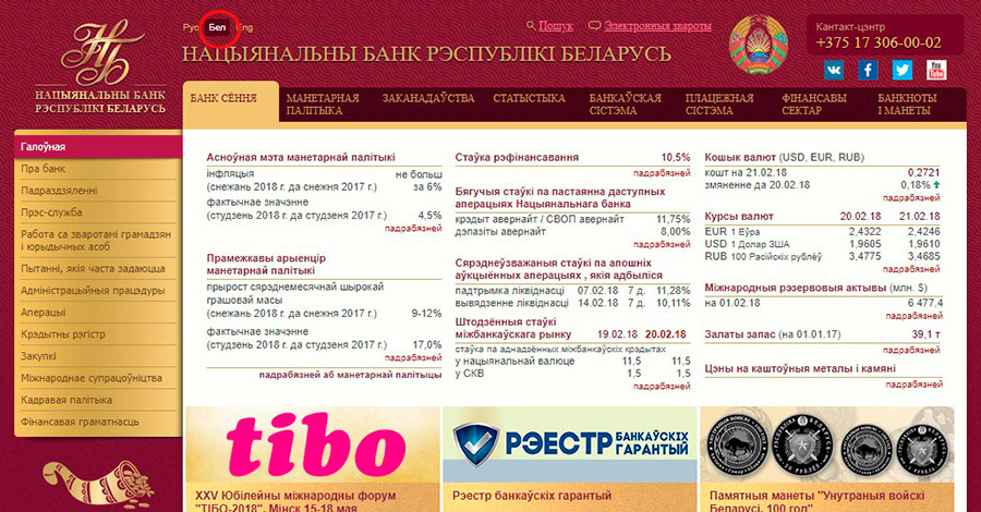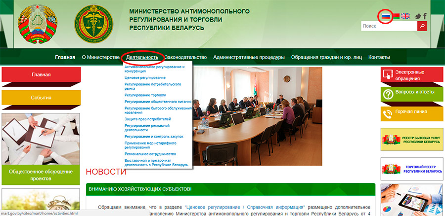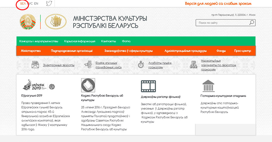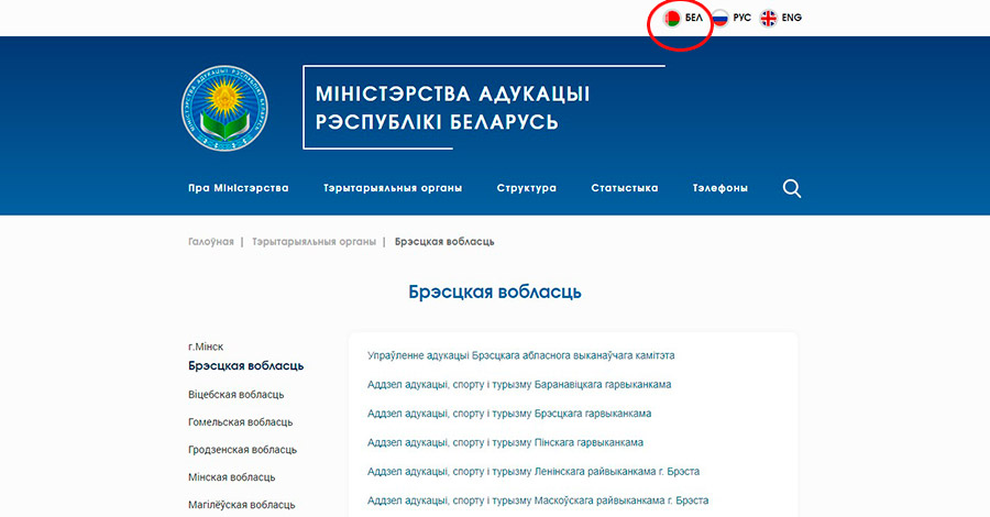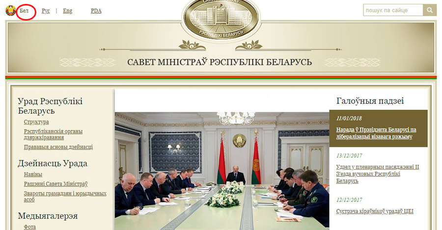 Згодна з Палажэннем Савета міністраў “Аб парадку функцыянавання інтэрнэт-сайтаў дзяржаўных органаў і арганізацый”, адным з патрабаванняў з’яўляецца прадастаўленне інфармацыі на дзяржаўных мовах Рэспублiкi Беларусь, а пры неабходнасці таксама на адной альбо некалькіх замежных мовах.