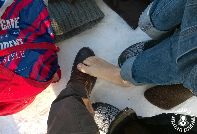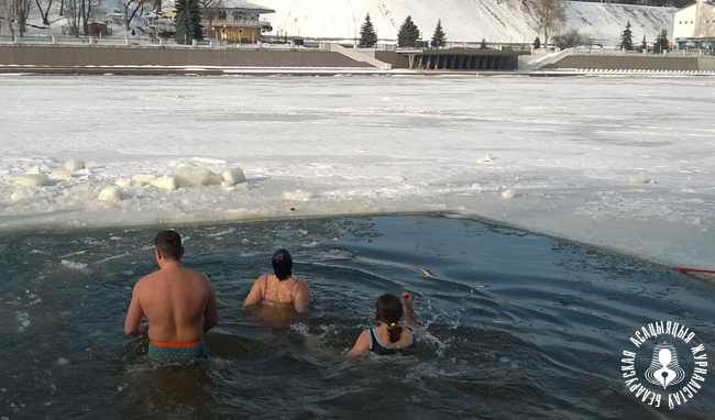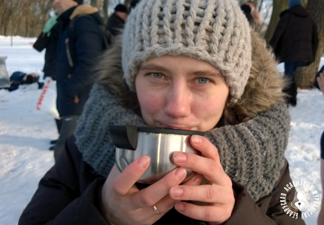 Самым складаным было развітацца з маімі валёнкамі і паставіць ногі на ручнік, які ляжаў на снезе. І хоць я апранула ваўняныя шкарпэткі, аднак холад нагамі ўсё роўна адчуваўся. Абкруціўшыся ручніком, я яшчэ змагла сфоткацца для ілюстрацыі матэрыялу (а рэдактар замовіла мне як мінімум тры фотаздымкі). Аднак, калі я апусцілася ў палонку, у якую, дарэчы, было і не так лёгка зайсці: бо на ільдзе – слізка, шкарпэткі, якія давалі хоць нейкае шчапленне, я ўжо зняла, а парэнчаў там не было аніякіх. Мой муж і калега ў гэты момант выконваў ролю фатографа, спрабуючы не ўпасці ў палонку. Дзякуй нейкаму дзядзечку, які даў руку мне і яшчэ нейкай жанчыне, каб я магла ўвайсці ў раку, а жанчына наадварот выйсці.