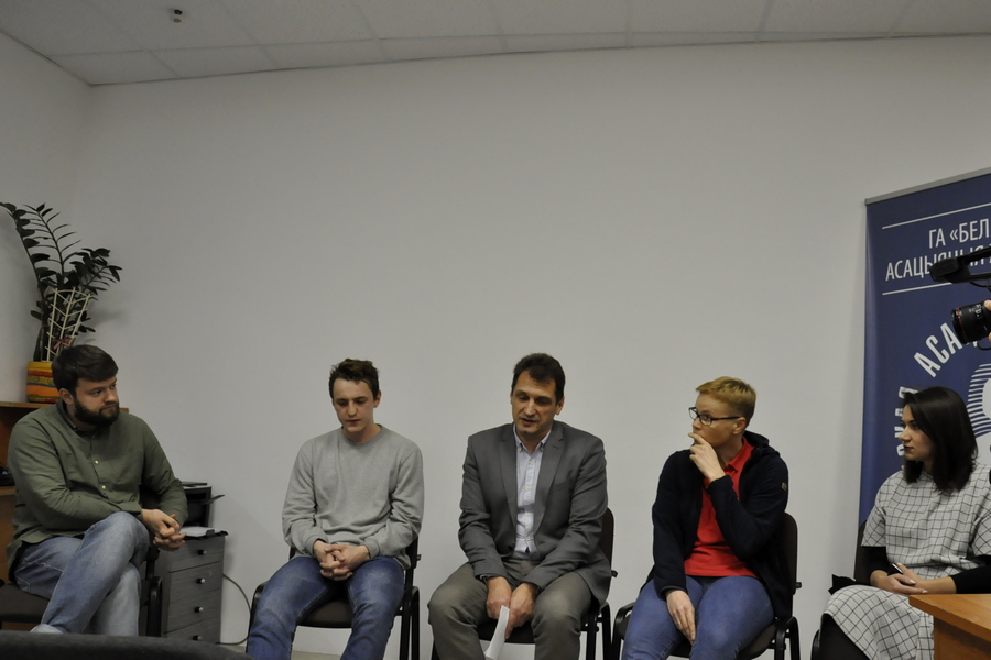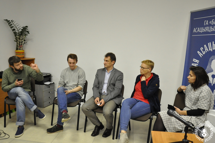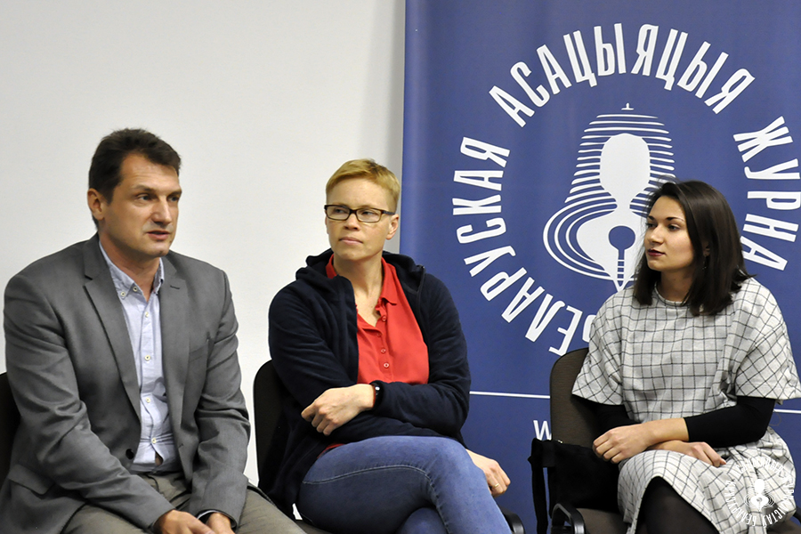 Об этом и не только в офисе ОО «БАЖ» дискутировали главный редактор TUT.BY Марина Золотова, редактор CityDog.by Дмитрий Соколовский, обозреватель «Радыё Свабода» Виталий Цыганков и заместитель редактора «Нашай Нівы» Анастасия Ровдо.