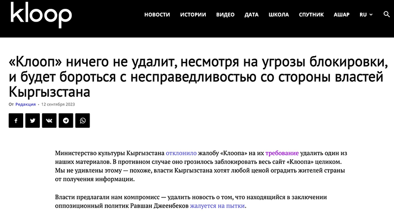 Спор возник относительно публикации о том, что находящийся в заключении оппозиционный политик Равшан Джеенбеков жалуется на пытки, сообщают сами журналисты «Клооп».