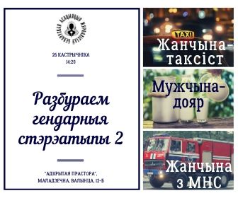 Абмяркуем, якія існуюць перадузятыя меркаванні пра пол, абавязкі і прафесіі. Як жывецца людзям з нетыповай для іх гендару прафесіяй. Запрашаем усіх жадаючых. На сустрэчы прадугледжаная кава і частаванне.