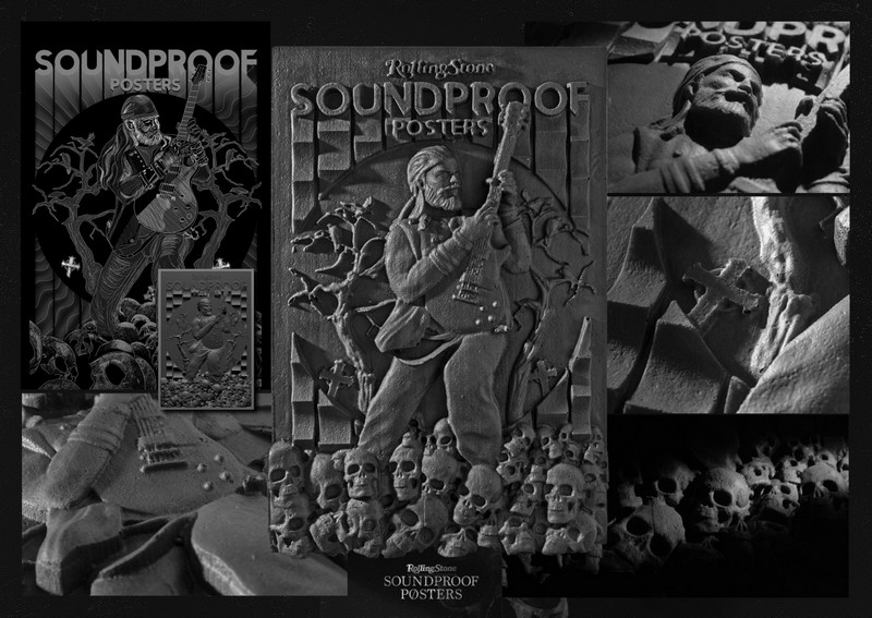 Постеры созданы из специального пористого материала, который поглощает звук. А значит, музыканты могут репетировать прямо в своей комнате, не причиняя неудобств близким. У этих постеров выпуклая, рельефная поверхность. Есть четыре варианта оформления — с Джими Хендриксом, Китом Ричардсом, Закком Уайлдом и Кико Лоурейро.
