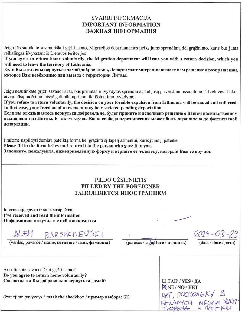 Таксама журналіст сцвярджае, што 25 сакавіка праз тэлефанаванне, а пазней праз ліст пад подпіс у Дэпартаменце міграцыі яму паведамілі пра пачатак працэдуры дэпартацыі. Але пісьмовага пацверджання гэтай інфармацыі ў Алега няма. Магчыма, такую выснову журналіст зрабіў з пісьмовай формы аб яго адмове дабравольна пакінуць Літву. У форме напісана, што ў такім выпадку «будзе прынята і выканана рашэнне аб гвалтоўным выдварэнні з Літвы».