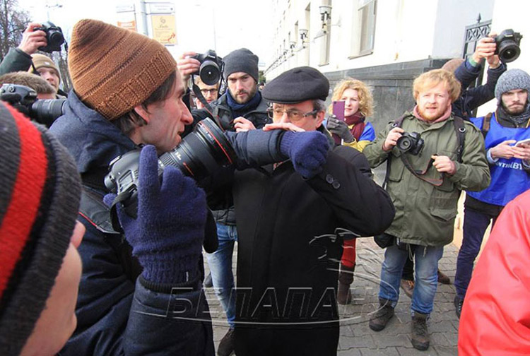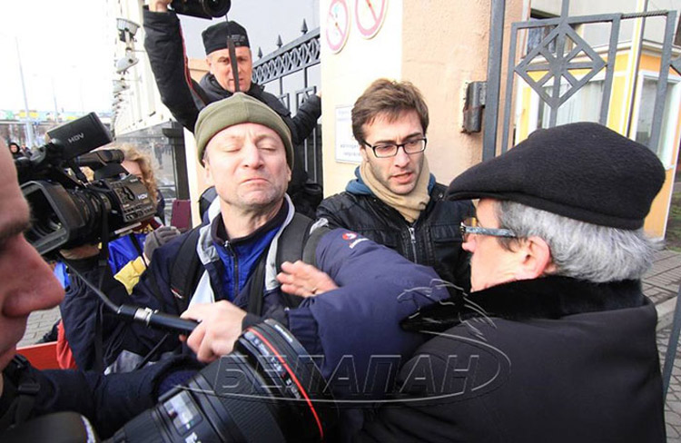 У прыватнасці, каля ўваходу ва ўнутраны двор БДУ ён пачаў нападаць на журналістаў з камерамі: Васіля Сямашку з БелаПАН і Вадзіма Заміроўскага з TUT.by.