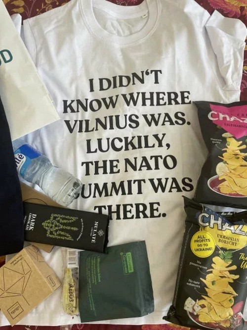 Акрамя таго, журналісты атрымалі цішоткі з надпісам з аднаго боку «Я не ведаў, дзе Вільня. На шчасце, там праходзіў саміт НАТА» і надпісам «Вільня неверагодна цудоўная» — з іншага.