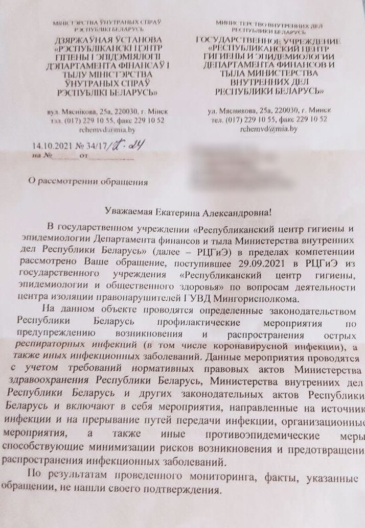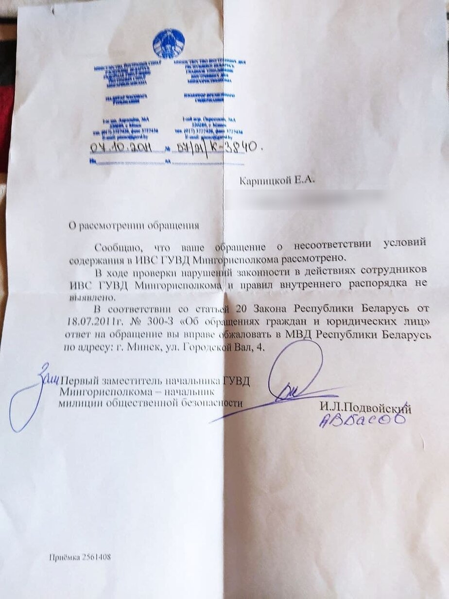 «Падчас праверкі парушэнняў законнасці ў дзеяннях супрацоўнікаў ІЧУ ГУУС Мінгарвыканкама і правілаў унутранага распарадку не выяўлена». Цікава, што скарга тычылася і ЦІП, але пра яго ў адказе нават і не згадалі: яны хоць і маюць з ІЧУ адзін адрас, усё ж там розныя супрацоўнікі і распарадкі