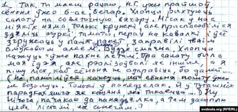 «Новы год прайшоў, сёньня ўжо 6‑га, вечар. Хлопцы гатуюць салату на сьвяточную вячэру. Місак у нас няма ніякіх, толькі конаўкі, але прыстасаваліся дзяліць агуркі, таматы, перац на кавалкі і ўсё загружаць у паліэтыленавы пакет, заправілі тваім аліўкавым алеем. Будзе смачна.