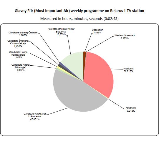 The state-run media actively worked for the campaign of one candidate, President Lukašenka. Even though his contenders were granted an opportunity to address the electorate via TV and the radio live, they remained overshadowed by the coverage given to the incumbent.