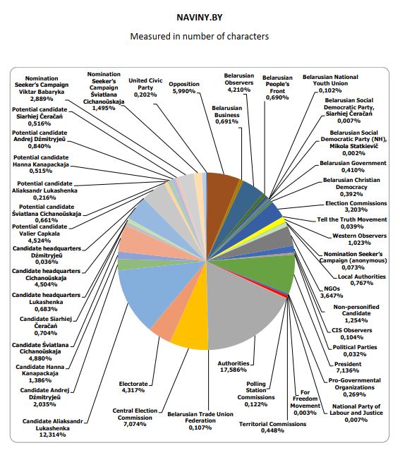 Naviny.by presented the largest number of election actors among all the monitored state-run and independent media, including BelTA. Interestingly enough, Mr Cichanoŭskaja’s campaign received more coverage than the candidate in person.