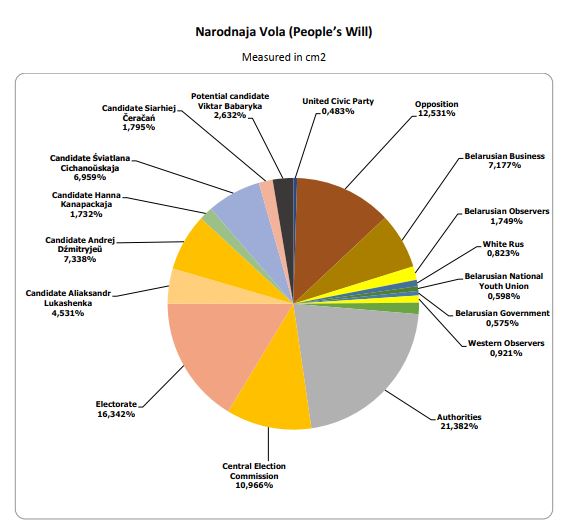 The Narodnaja Vola paper gave the opposition and its activities quite a lot of coverage, assessing them in a neutral and critical manner, and spoke about the CEC neutrally and critically. The paper presented the presidential hopefuls Mr Dźmitryjeŭ (6%) and Mr Čeračań (2%) neutrally, spoke negatively about Mrs Kanapackaja (about 2%), and covered Mrs Cichanoŭskaja in a neutral light, at the same time speaking positively about her campaign (the combined share was about 8%). The Narodnaja Vola spoke critically and neutrally about incumbent/presidential candidate Lukašenka, allocating to him about 6% of the space given to all the monitored actors.