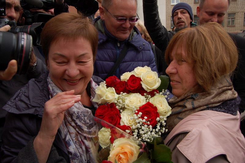 Doznes of colleagues, friends, journalists met Sviatlana Alexievich near the editorial office of Nasha Niva where the writer was going to give an online interview.