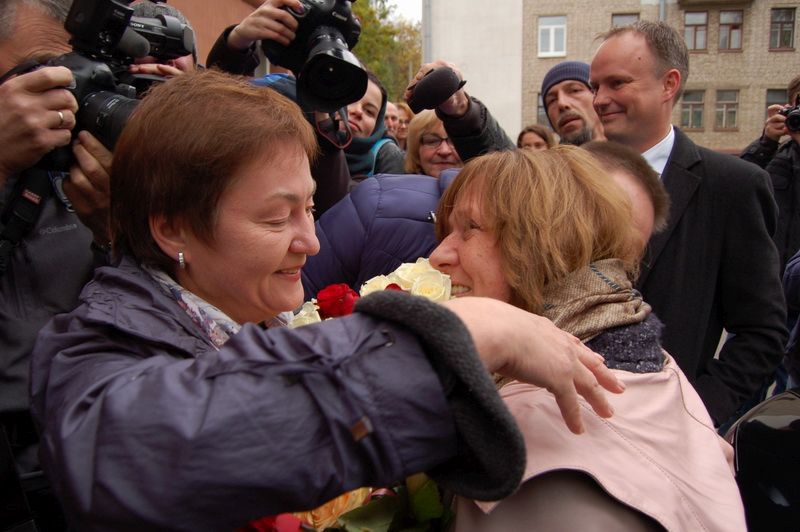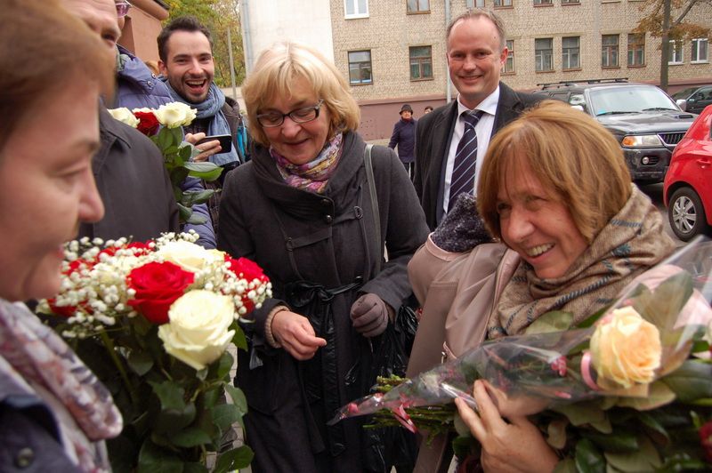 Doznes of colleagues, friends, journalists met Sviatlana Alexievich near the editorial office of Nasha Niva where the writer was going to give an online interview.
