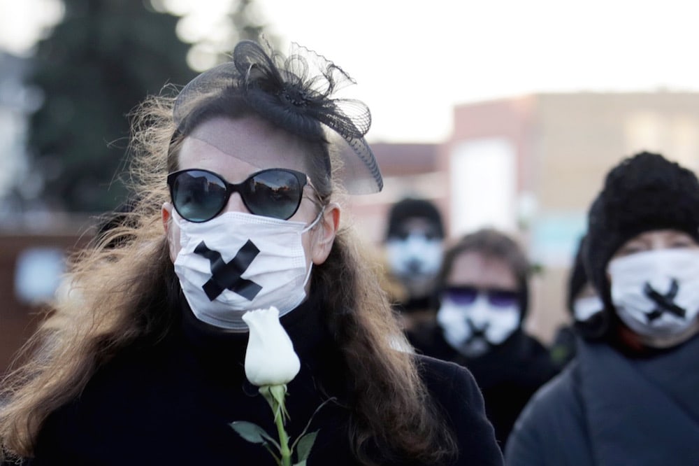 Women wear­ing black cloth­ing and tape over their mouths demon­strate against the con­vic­tion of a jour­nal­ist and a doc­tor over the dis­clo­sure of a pro­test­er’s med­ical records, Min­sk, Belarus, 2 March 2021, -/AFP via Get­ty Images