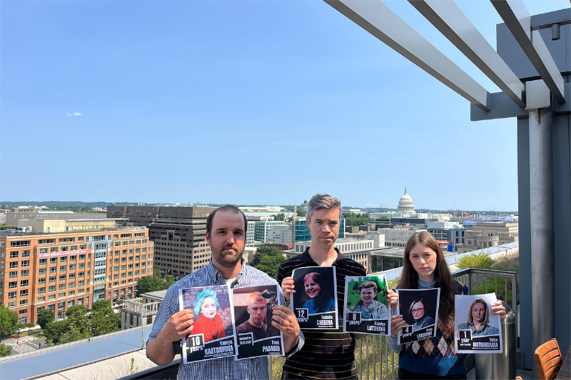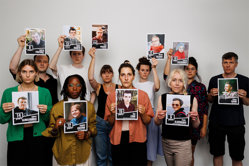 Representatives from the organization’s headquarters and its offices in multiple cities such as Berlin, Brussels, Dakar, Geneva, London, Rio de Janeiro, Stockholm, Tunis, Taipei, Vienna, and Washington D.C., took collective pictures with portraits of their Belarusian colleagues to express their support.
