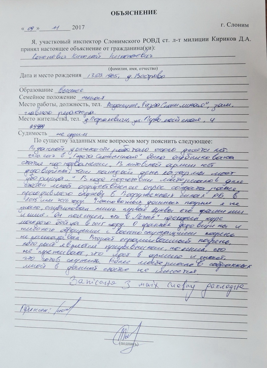 Dzmitry Kirykau, a police officer from Slonim District Police Department came to the ‘Gazeta Slonimskaya’ editorial before lunch on November 9th. He asked the newspaper journalists to provide explanations as for the ways they had been preparing the article about hazing.