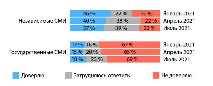 В информационном онлайн-пространстве страны по-прежнему преобладают независимые, а не государственные новостные сайты. Хотя большинство независимых медиасайтов было заблокировано в течение 2020—2021 годов, они диверсифицировали свои каналы распространения информации в социальных сетях и мессенджерах и сохранили доверие аудитории.