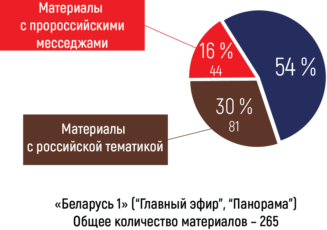 Основным источником пророссийской пропаганды в Беларуси остается телевидение. Несмотря на продекларированное белорусскими властями стремление к увеличению белорусского контента в телевизионных СМИ, 4 из 9 телеканалов, включенных правительством в обязательный общедоступный телепакет, основаны на российской телепродукции и демонстрировали в прайм-тайм более 60% телепередач российского производства. При этом время, которое занимает российская телепродукция в эфире юридически белорусских телеканалов, еще больше в результате демонстрации продолжительных фильмов и сериалов. Так, если количество российских передач в прайм-тайм на телеканале “Беларусь‑1” составило 38,18% от общего числа передач, то время показа только росссийских сериалов заняло уже 67,61% объема эфирного времени. В сумме российский контент безусловно преобладает в нашем эфирном прайм-тайме.