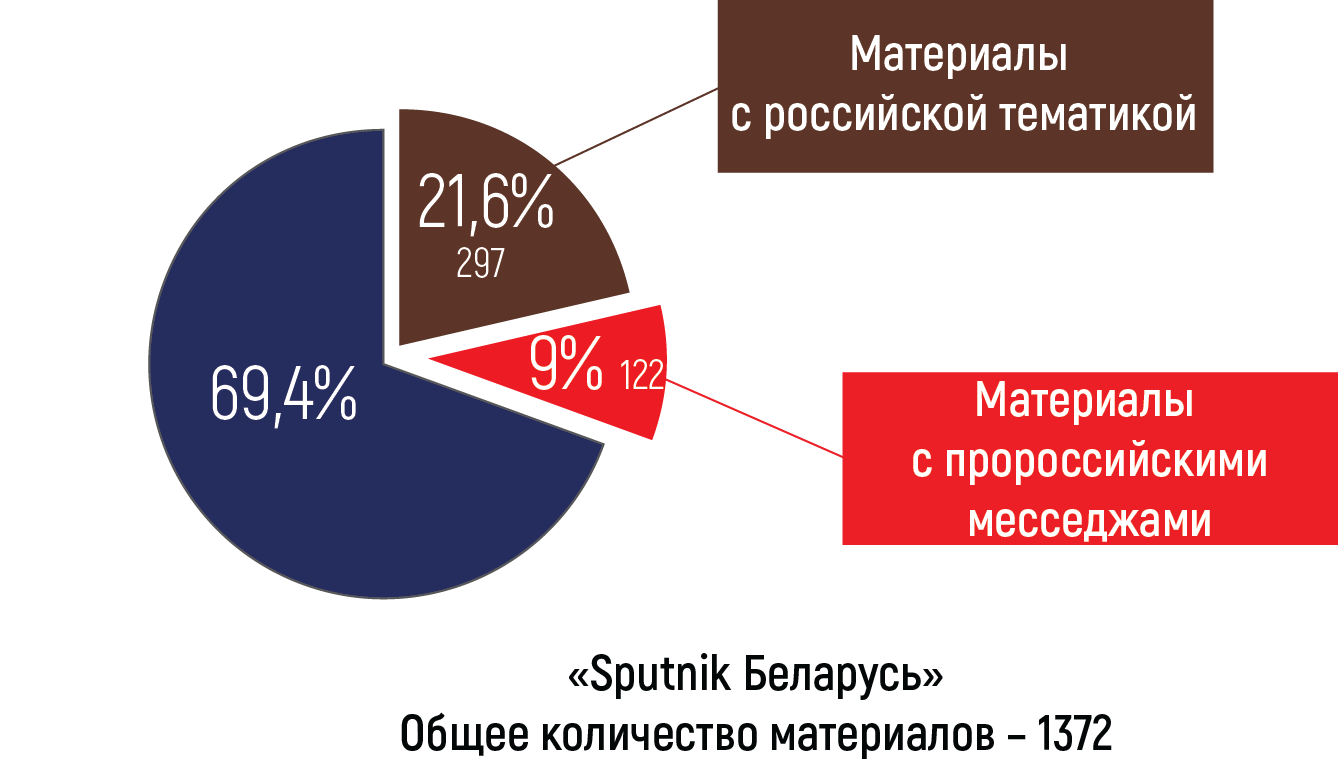 Процентное соотношение материалов с месседжами российской пропаганды к общему количеству материалов на «Sputnik Беларусь» оказалось даже меньшим, чем на телеканале «Беларусь 1». Однако общее количество таких материалов было весьма значительным и подача их отличалась ангажированностью ведущих видеосюжетов. Треть материалов с месседжами российской пропаганды носила выраженный антиукраинский характер.