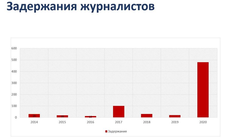 Абсолютное большинство атак на журналистов и медиа в 2020 году было связано с освещением ими выборов, прошедших в августе, и последующих за ними массовых протестных акций. В 95% случаев «агрессорами» выступали представители власти (сотрудники силовых структур, должностные лица и т.д.). Наиболее массовым типом нарушения прав журналистов стали их задержания. БАЖ зафиксировал 481 задержание за год, что более чем в два раза больше, чем за шесть предыдущих лет, вместе взятых. Предыдущим «пиковым» годом был поствыборный 2011 г., когда журналистов задерживали 167 раз. Почти столько же журналистов было задержано только в августе 2020 г. – 160.