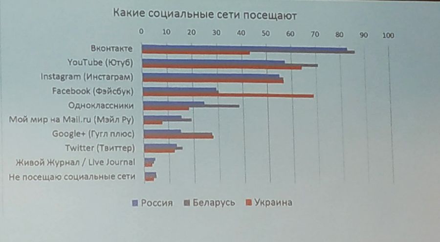 На первом месте в Беларуси и России — социальная сеть «ВКонтакте» (в Украине ее место из-за блокировок занимает Fаceboок), на втором и третьем месте во всех трех странах Youtube и Instagram. При этом, как показывают регулярные исследования, рост аудитории этих двух сетей ускорился за последние пару лет.