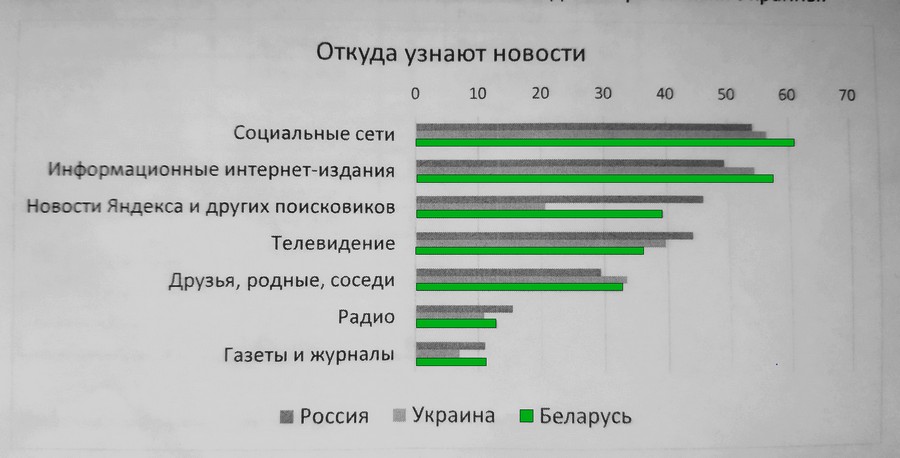 Впрочем, телевидение по-прежнему остается для белорусов значимым источником информации. Согласно опросу, белорусская молодежь смотрит новостные телевизионные передачи несколько меньше, чем их сверстники в России и Украине (36%, 44% и 40% соответственно), но отличия невелики.