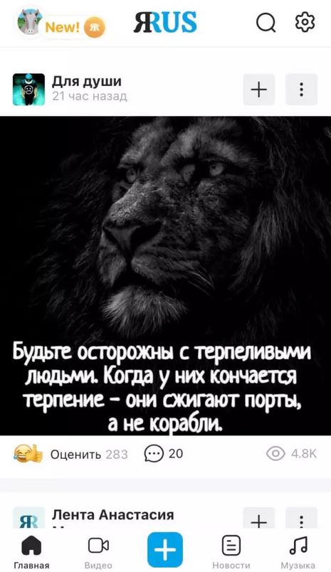 На главной странице выводится «главная лента», напоминающая ленту во «Вконтакте» — на ней так же показываются публикации ресурсов, на которые подписан пользователь, популярные посты, новостные сообщения и видео.