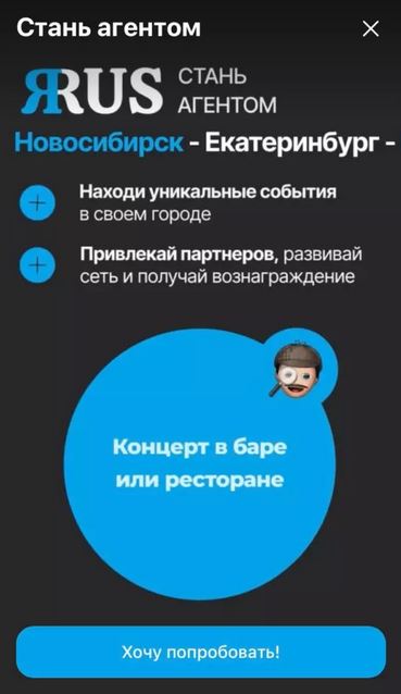 Ещё один раздел соцсети — «События», где можно увидеть афиши концертов, театральных представлений, мастер-классов и других мероприятий в своём городе. Приложение предлагает пользователям стать «агентами» — заполнять раздел об актуальных мероприятиях и привлекать партнёров за вознаграждение.