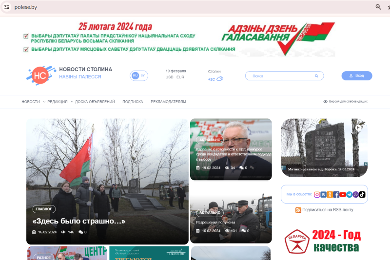 Напоминаем, что накануне нынешних выборов в Столинском районе Мининформации первоначально заблокировало независимый интернет-ресурс stolin.bу, а 13 февраля решением суда он был признан «экстремистским». Редактор этого сайта Александр Игнатюк был задержан силовиками и помещен под стражу в августе 2023 года. Его личные страницы в социальных сетях власти также посчитали «экстремистскими материалами».