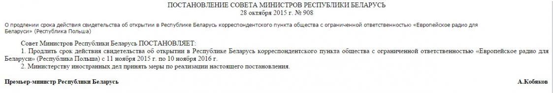 Совет министров своим постановлением от 28 октября № 908 продлил «срок действия свидетельства об открытии в Республике Беларусь корреспондентского пункта общества с ограниченной ответственностью «Европейское радио для Беларуси» (Республика Польша) с 11 ноября 2015 г. по 10 ноября 2016 г.».
