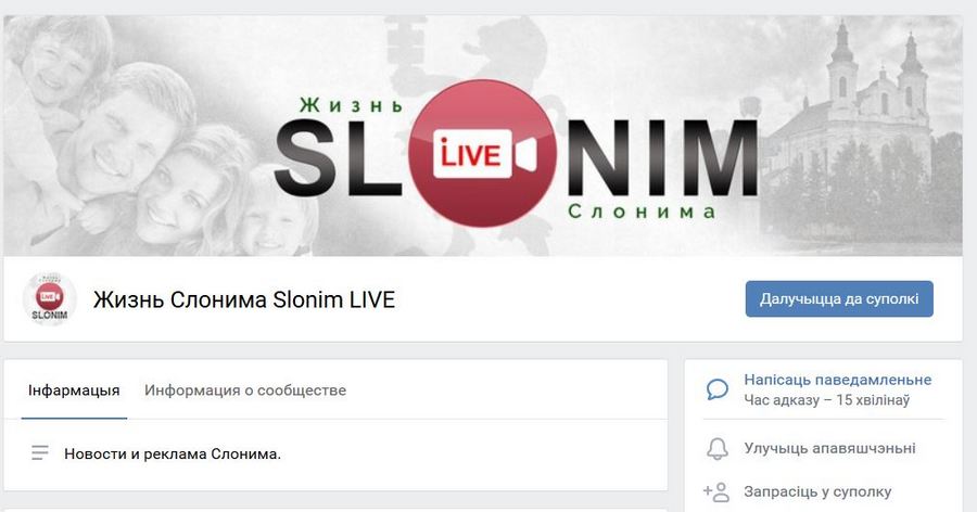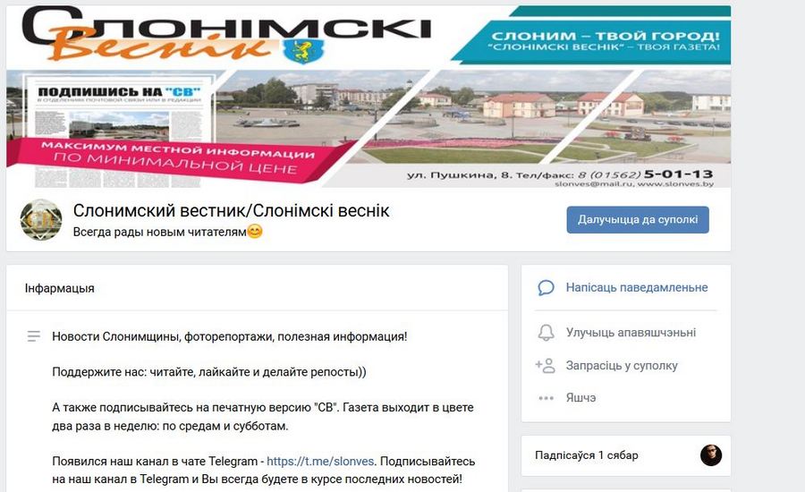 Официальный паблик районной газеты “Слонімскі вестнік”. Здесь все предельно ясно с контентом: в большинстве это — материалы с сайта газеты slonves.by. Также встречаются репосты из пабликов официальных учреждений и организаций. Например, «Молодежь Слонимщины», БРСМ и т. д.