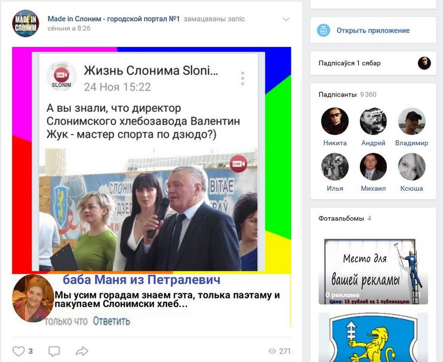 Первая запись в сообществе датирована далеким 2009 годом, а вторую запись на стене оставил не кто иной, как популярный блогер Ильдар Хабибуллин, более известный как Ильдар Приятный (Ильдар родом из Слонима).