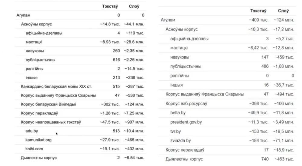 С одной стороны это хорошо ложится в официальную версию о мощности серверов. Но в восстановленном Корпусе не просто сократились, а полностью исчезли целые подкорпусы: Корпус необработанных текстов (907 млн слов), включавший тексты с сайтов kamunikat.org (465 млн слов) и knihi.com (432 млн слов), конкорданс белорусского языка XIX в., включавший практически все сохранившиеся произведения художественной литературы, написанные в указанный период на белорусском языке (287 тыс. слов), и Корпус обеих белорусских Википедий (124 млн слов).