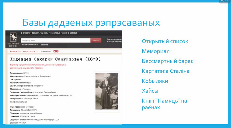 Сайт «Хайсы» — его по книгах памяти начали собирать активисты, заботившиеся о мемориале «Хайсы», . Это деревня под Витебском, где расстреливали людей. Собственно, книги памяти по разным районам — это еще один источник. Там можно искать участников Второй мировой войны.