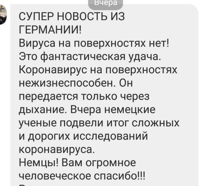 Многие белорусские СМИ сообщили своим читателям о «самом вероятном пути передачи коронавируса». Однако СМИ не уточнили, что немецкий ученый, который сделал эти заявления, стал объектом критики в Германии. Распространение информации о том, что «вероятность заболевания от контакта с предметами крайне мала», может нанести вред здоровью белорусам, и без того дезориентированным властями.