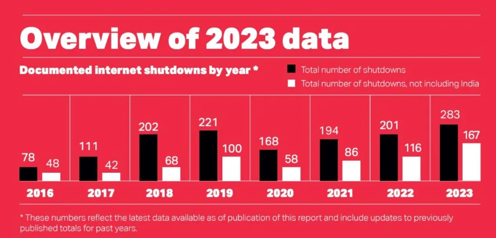 Согласно исследованию, проведенному международной организацией Access Now, занимающейся защитой цифровых гражданских прав, в прошлом году было задокументировано 283 шатдауна в 39 странах — этот год стал рекордным по числу отключений интернета.