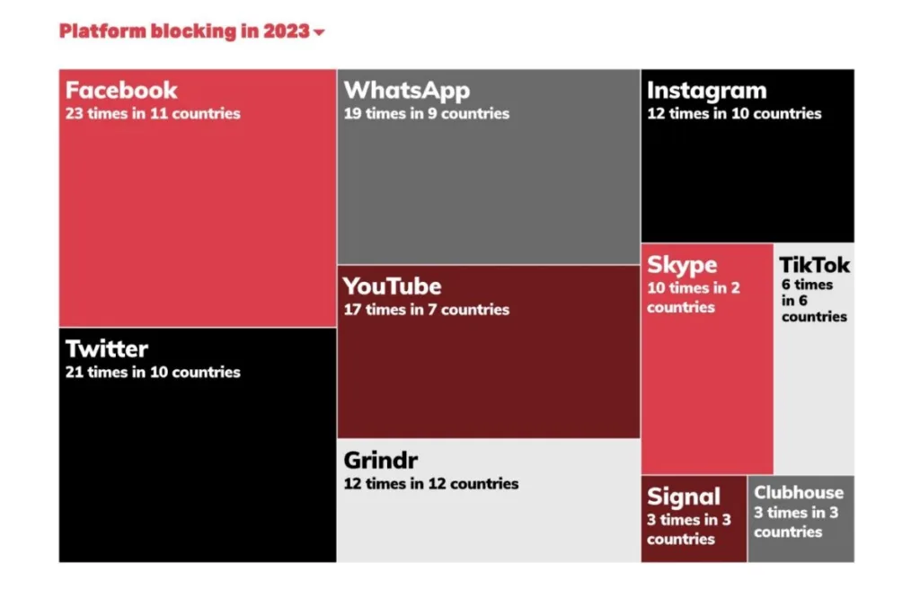 Исследование показало, что в число наиболее блокируемых платформ вошли Facebook, Twitter, YouTube и WhatsApp, которые позволяют оперативно обмениваться контентом.