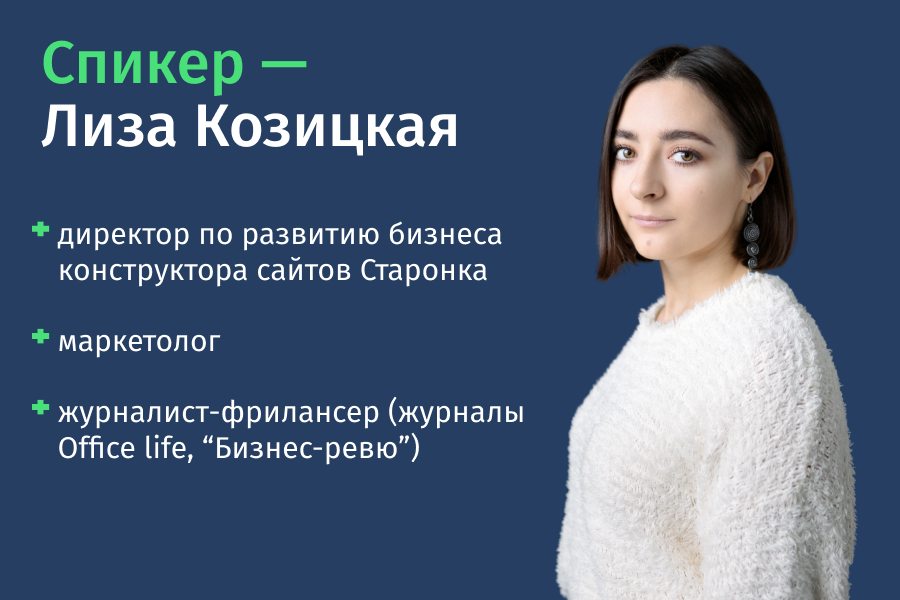 Спикер: Лиза Козицкая, директор по развитию бизнеса конструктора сайтов Старонка, маркетолог, журналист-фрилансер. *Все участники получат гайд по созданию сайта и другие бонусы от конструктора сайтов Старонка.
