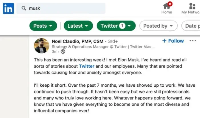 Допустим, вы хотите узнать, публиковал ли кто-то из сотрудников Twitter что-нибудь об Илоне Маске. Сделайте следующее: введите слово «Маск», нажмите на «Публикации» (Posts), далее «Все фильтры» и выберите «Компания, в которой работает автор» (Author company). Введите «Twitter» или «X».