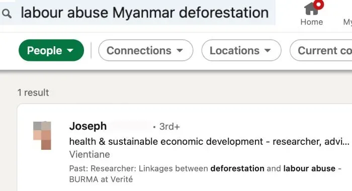Например, введите в поиске «нарушение трудовых прав вырубка лесов в Мьянме» (labour abuse Myanmar deforestation) и нажмите на «Люди» (People).