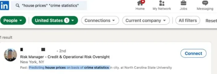 Связь между ценами на жильё и статистикой преступности. Поиск по фразе в LinkedIn. Скриншот: Хенк ван Эсс