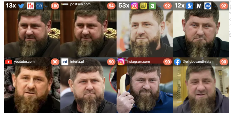 Бельгийские фактчекеры из Knack использовали инструмент распознавания лиц PimEyes, чтобы найти мужчину в военной форме (в жёлтым квадрате), который был назван различными американскими и британскими СМИ российским генералом-майором в отставке, призванным на службу для участия в войне в Украине. Инструмент не дал результатов, но позволил идентифицировать двух других людей на фотографии. Дальнейшее расследование показало, что на самом деле этот человек — бывший российский пограничник.