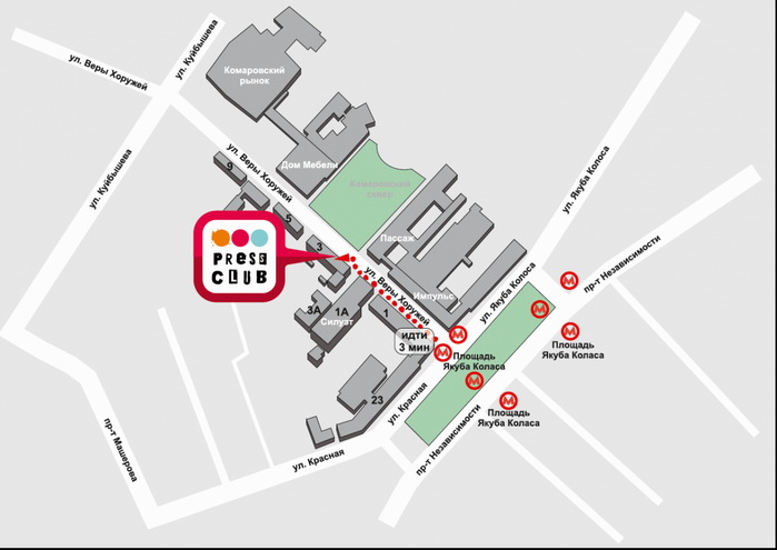 Правда, чтобы туда попасть, придется пройти небольшой квест. Сама площадка Пресс-клуба находится всего в нескольких минутах ходьбы от ст.м «Якуба Коласа» по ул. В. Хоружей, 3, офис 601 (офисное здание), а вот чтобы найти помещение в самом здании придется чуть-чуть потрудиться. Но ведь настоящие журналисты всегда доходят до самой сути, правда? 😉 Смотрите карту в приложенном файле, а также на нашем сайте в скором времени!
