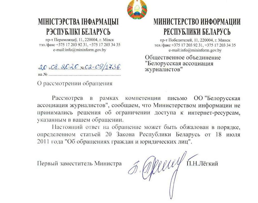 В письме говорится, что Министерство информации не принимало решения о блокировке интернет-сайта Белорусской ассоциации журналистов. Однако в реальности сайт недоступен на территории Беларуси со второй половины 9 августа.