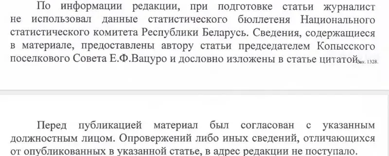 Журналистка Ольга Хаецкая подтвердила, что не использовала официальные статистические данные, а записала все цифры со слов главы Копысского сельсовета Екатерины Вацуры и привела в статье ее точное высказывание. Текст статьи был согласован с председателем сельсовета, и «никаких опровержений или иной информации, отличающейся от приведенной в статье, в редакцию не поступило», — подчеркивает первый заместитель министра информации.