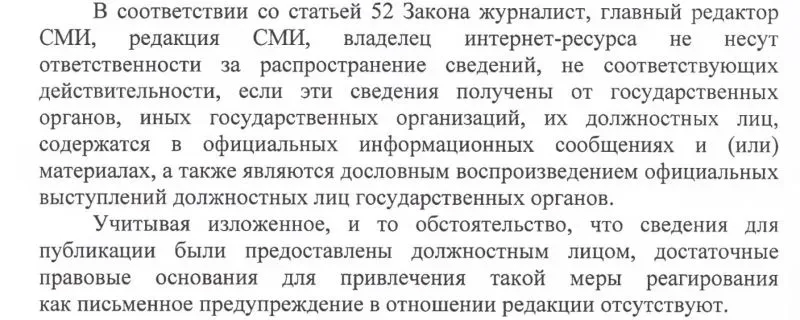 Отсюда следует, что читатели не имеют возможности получить точную информацию, если сама редакция не желает удовлетворить требования просителей. В соответствии со статьей 52 Закона о средствах массовой информации, персонально редакторы и владельцы интернет-ресурсов не несут ответственности за достоверность информации, полученной от государственных органов, иных государственных организаций и их сотрудников.