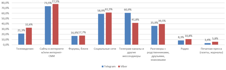 Респонденты, которые назвали Viber как мессенджер для получения информации, чаще смотрят телевидение для получения информации. Напротив, пользователи Telegram значительно чаще, в сравнении с пользователями Viber, получают нужную информацию из телеграм-каналов и других мессенджеров.