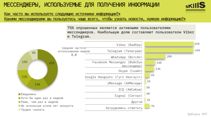 В целях получения информации чаще всего белорусы пользуются Viber (66%) и Telegram (66%).