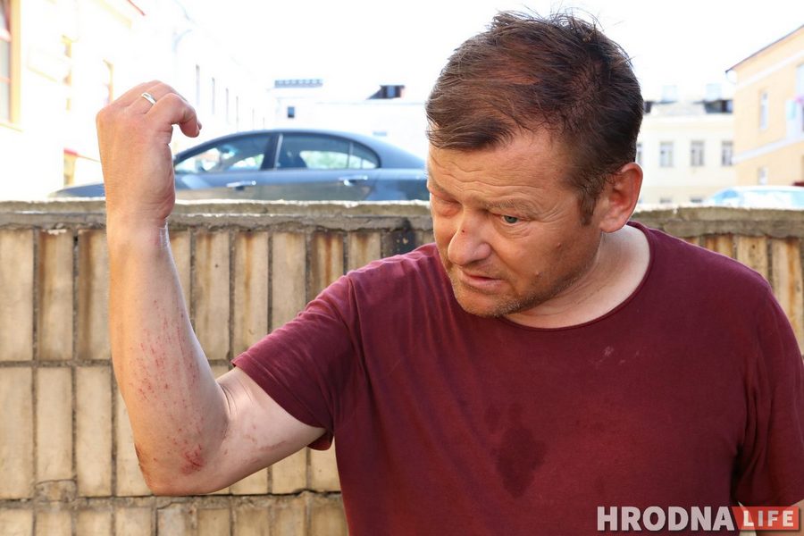 «Я у него спросил – есть ли Саенко, он сказал, что есть. И предложил отойти со ступенек. Мы отошли и приехал хамер, который ездит по Гродно и автозак. Люди начали разбегаться и делать вид, что пришли по своим делам или шли рядом. Мы пошли к магазину и в тот момент приехал еще один омоновски бус и стали выбегать сотрудники. Мне сразу удар ногой – выскочили зубы и разбились очки».