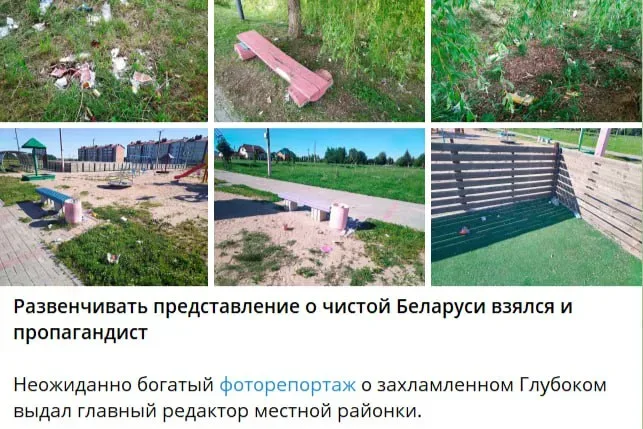 Эти фотографии и перепечатал телеграм-канал «LIVE Витебск, я гуляю!», сопроводив текстом: «Развенчивать представление о чистой Беларуси взялся и пропагандист. Неожиданно богатый фоторепортаж про захламленное Глубокое выдал главный редактор местной районки. Он показал, что груды мусора можно встретить во многих парках и местах отдыха райцентра».